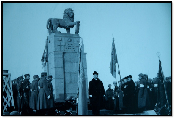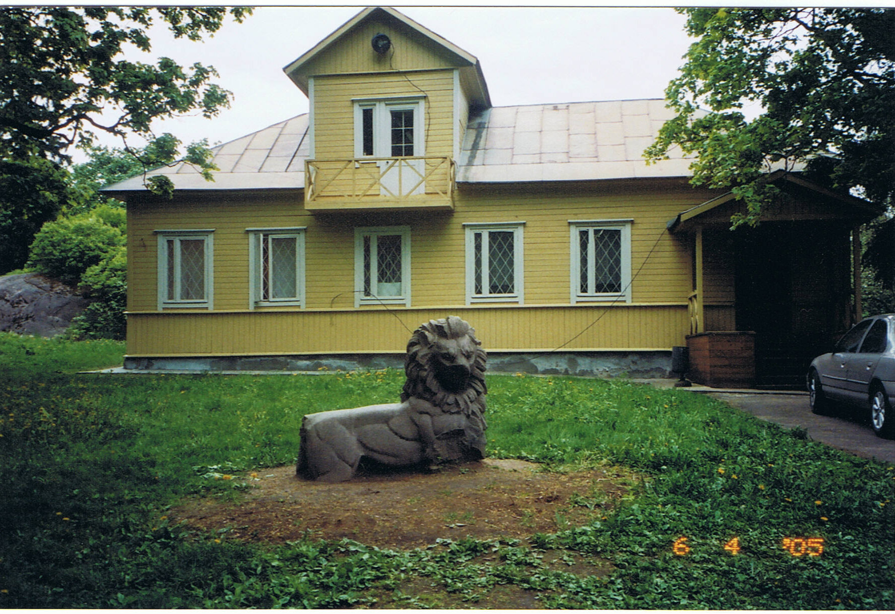 Leijonan alkuperäinen paikka oli Tervaniemi Maakunta-arkiston vieressä, leijonaa tuuraa nyt Pietari Suuren patsas. Sotien aikana nämä patsaat vaihtelivat paikkaa aina sen mukaan kenen lippu liehui Viipurin linnan tornissa. Nykyinen paikka on Monrepon puiston erään talon pihassa, osa patsaan jalustasta on taltioitu Viipurin linnan museoon. MK