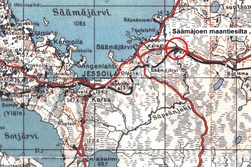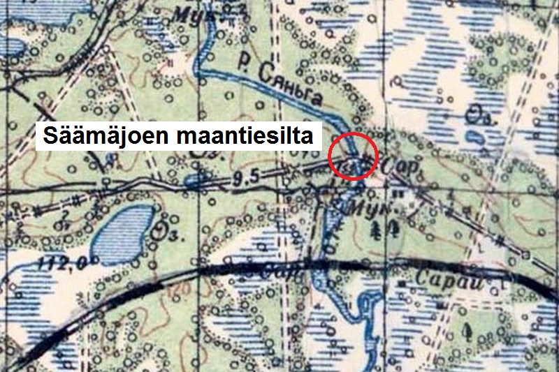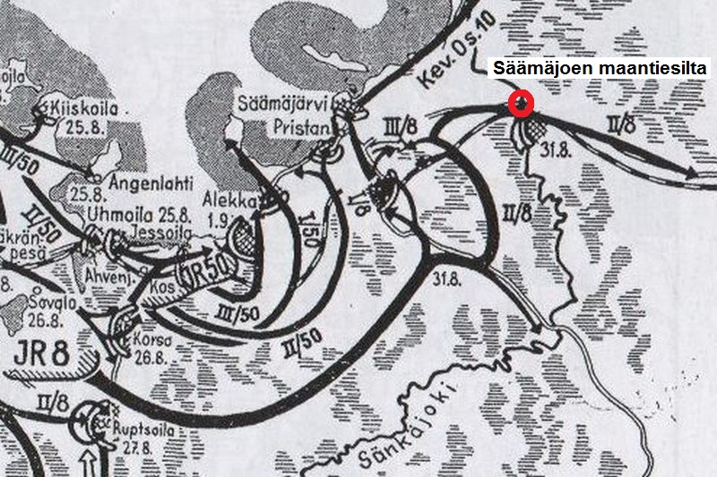 JR 8:n teki suomaaston läpi syvän ja ulottuvan koukkauksen, ja sen itäisenä tavoitteena oli maantie- ja rautatiesiltojen haltuunotto Säämäjoella (nimeltään myös: Säpsänjoki, Sänkäjoki tai Sjangajoki). Rykmentin II Pataljoona ylitti myllypatoa pitkin joen siltojen välillä ja yllätti vihollisen siltavartiot 31.8.1941 illalla. Maantiesilta saatiin ehjänä haltuun ja rautatiesiltakin pääpiirtein ehjänä. Tämän jälkeen varmistus työnnettiin kahden kilometrin päähän kaakkoon. ENa 2017.