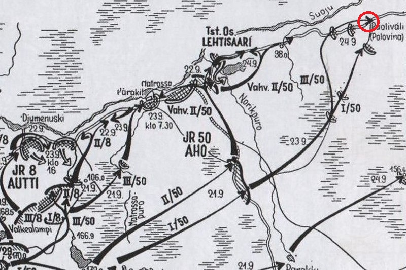 Jalkaväkirykmentti 50:n joukot valtasivat Puolivälin kylän (Polovinan) 24.9.1941.
