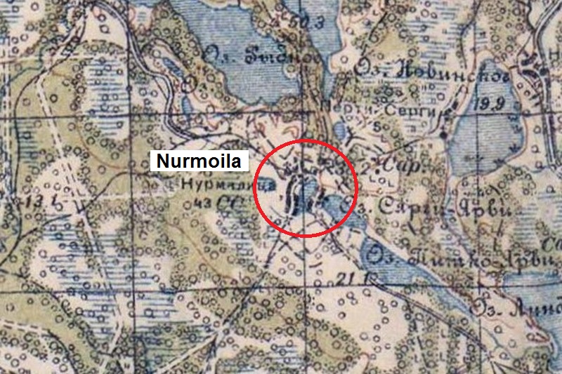 Nurmoilan kylän valtasi I/JR 44 (5.D) yllättämällä kylässä olleen venäläisen 3.Divisioonan huoltokeskuksen 6.9.1941. Joukkomme irtautuivat kylästä Viteleenjoki-linjalle kesäkuun 1944 lopulla. ENa 2017.
