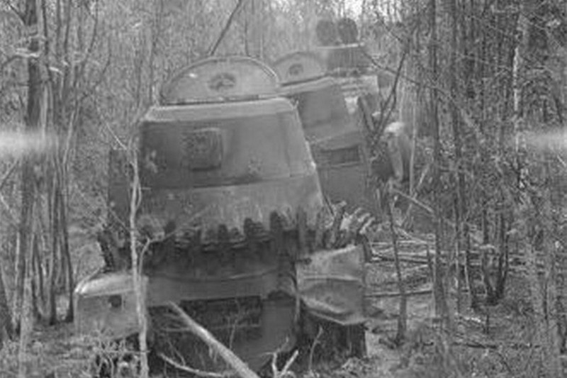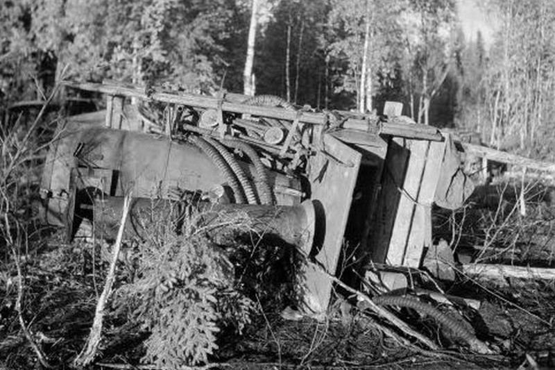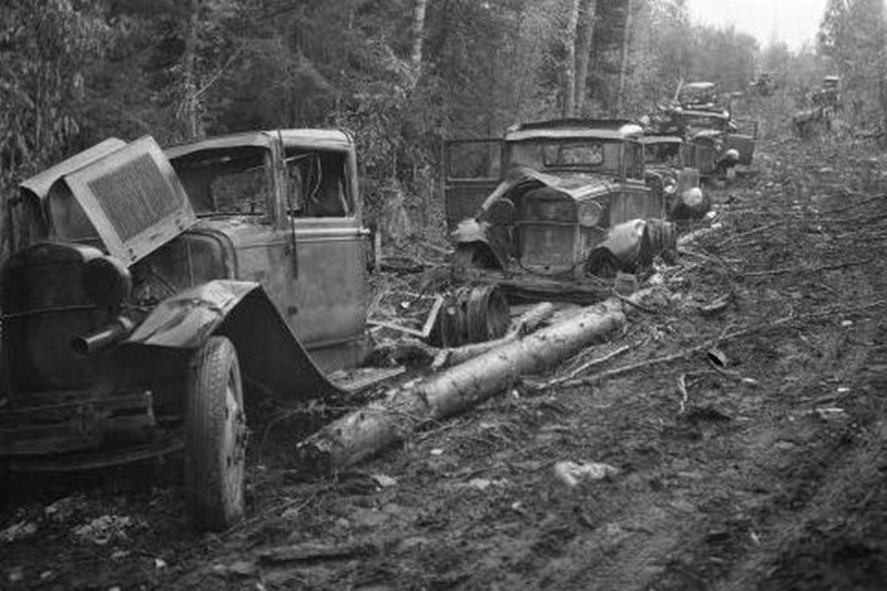 Jyrkässä käänteessä putoaa mutainen, motin sivulla kiemuroiva polku rotkomaiseen kohtaan, missä pilviä hipovien ikikuusien hämärässä alkaa autojen ja panssarivaunujen hautausmaa. Palaneen metallin ja bensiinin käry leijailee pistävänä vetotraktorien ja kuorma-autojen luona, joiden uumenista yhä vielä tuprahtelee kitkerää savua. Korppeja rääkyy ylhäällä puiden latvoissa ruumiita vaanien. Käänteeseen seisahtunut jättiläistankki on työntynyt niin korkealle puolittain kaatunutta kuusta vasten, että näyttää siltä, kuin olisi jokin alkuaikojen hirmulisko koko raskaalla painollaan kiipeämässä ahmimaan ikipuun mustanvihreitä, meheviä havuja. Kylmä iltataivas kirkastuu hitaasti tämän kauhun paikan yllä.