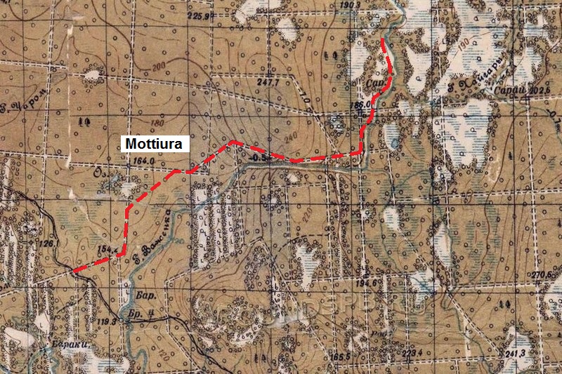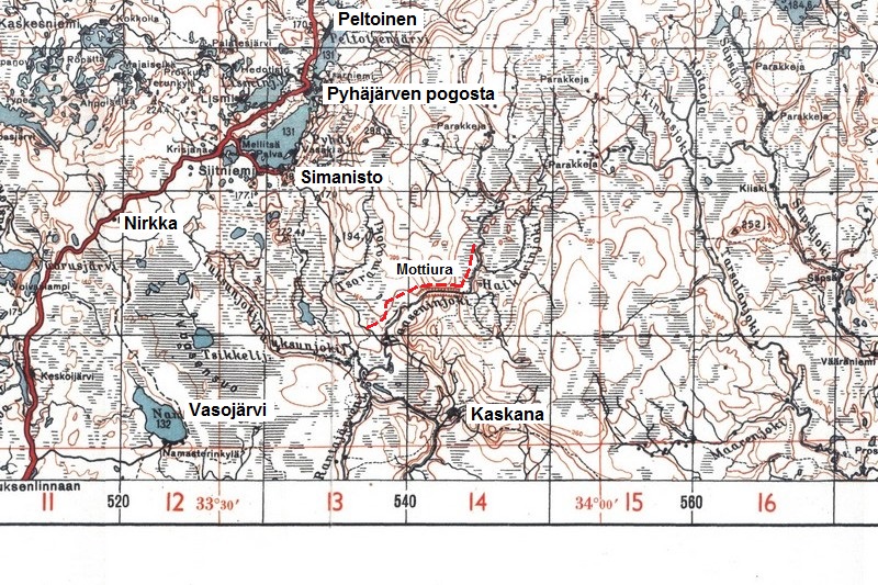 Viime päivien sotilaallinen sensaatio on ollut Kaskanan motin synty. Motti, jonka pituudeksi väitetään kokonaista 16 kilometriä, syntyi venäläisten joukkojen yrittäessä murtaa itselleen tietä korven kautta joko Äänisen tai Syvärin rantaan. Miten hiljaiseksi muuttuu mahtavinkin sodan jälki Aunuksen korpien ajattomassa ilmapiirissä. Vasta pari päivää on kulunut motin laukeamisesta, mutta jo nyt vallitsee sen ympärillä painostava elottomuus ja unohdus. Se on kuin kuolemassa tuskallisesti nytkähteleviin kiemuroihin jäykistynyt teräksinen jättiläismatelija, jonka pää on odottamatta murskattu. Kilometri kilometrin jälkeen saa kosteutta tihkuvassa, hämärässä metsässä kulkea motin sivua tapaamatta ainuttakaan elävää olentoa. Syysillan usvainen ja hievahtamaton ilma painaa sekasorron täyttämää metsätunnelia kuin holvi.