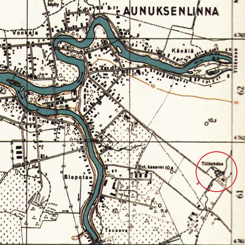 Jatkosodan sotatoimialueella tarvittiin tiiliä tulisijoihin, savupiippuihin sekä muihin kovaa rakennusmateriaalia vaativiin kohteisiin. Aunuksenkaupungin tiilitehdas, joka sijaitsi puolitoista kilometriä keskustasta kaakkoon, tuotti tiilet Etelä-Aunuksen ja Syvärin rintaman rakennuskohteisiin. ENa 2017.