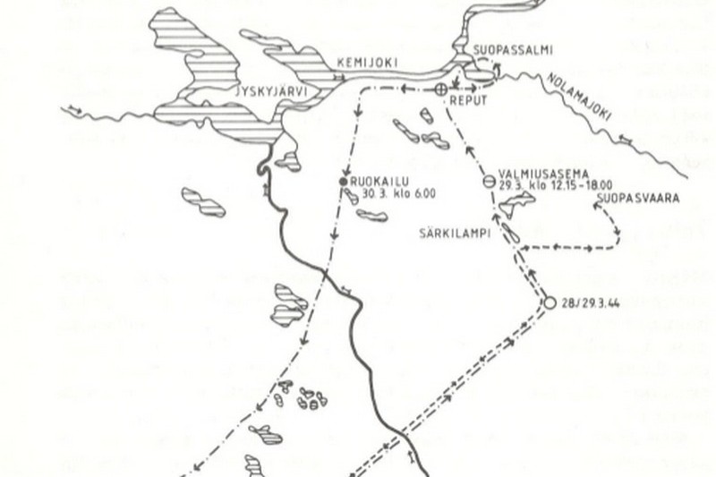 Samaan aikaan toisaalla... Osasto Raipala oli siirtynyt 29.3. iltahämärässä hyökkäyslähtöasemiin Suopasvaaran iv-aseman tuntumaan. Suunnitelmana oli tehdä yllätyshyökkäys, mutta kun Suopassalmen suunnalla tulipalojen punainen kajastus alkoi loimottaa taivaalla, mahdollisuus yllätykseen heikkeni. Kuitenkin odoteltiin vielä pari tuntia toimintavalmiina ja päätettiin sitten iskeä, mutta iskujoukon lähestyessä iv-asemaa vihollisen vartiomiestä ei hämännyt edes se, että tiedettiin tunnussana, jonka lausui ja vartiomiehen lisäkysymyksiin vastasi venäjäntaitoinen sissimme.