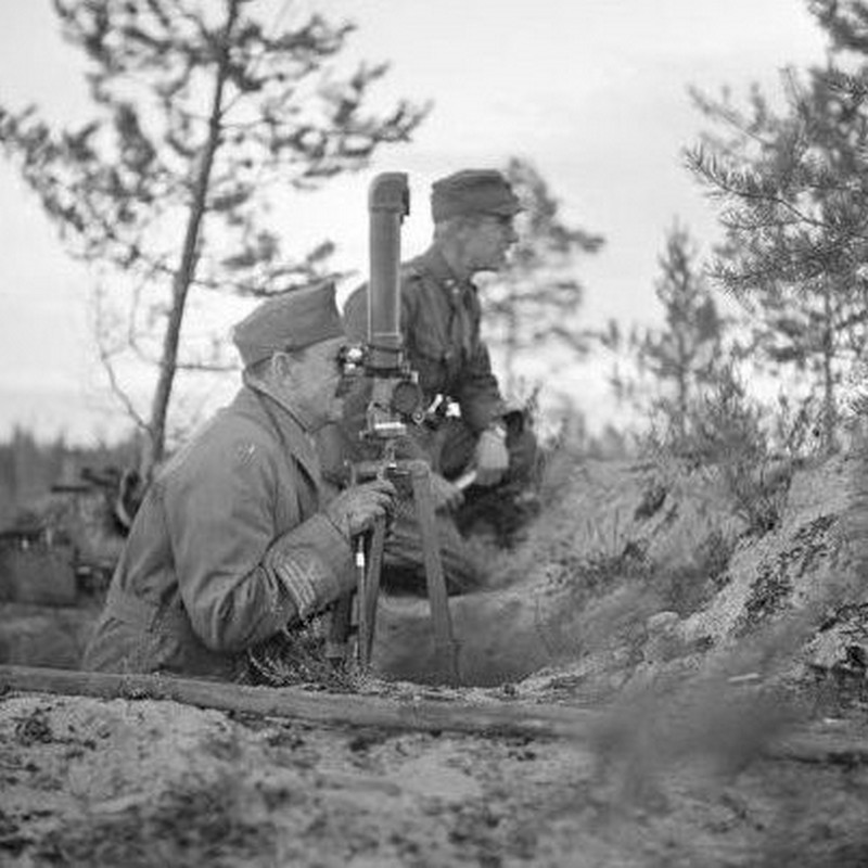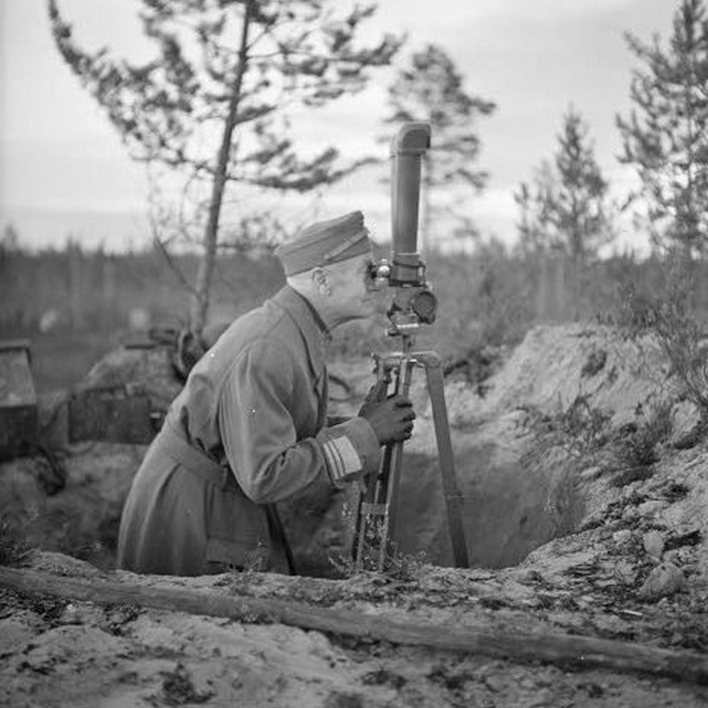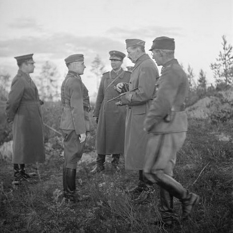 Siirryimme koko joukko tykistön tulenjohtopaikalle. Siitä näkyivät vastarannan kaupungin yksityiskohdatkin varsin hyvin. Tykkimme ampuivat harvaa tulta, ja vihollinen vastaili yhtä harvakseen. Ylitsemme ujelsi kranaatteja, jotka poksahtelivat nummelle. Sodan tuntu oli kyllä todellinen. Juuri äsken tässä oli saanut surmansa tykkimies ja toinen haavoittunut. Ylipäällikkö kutsui luokseen Panssarivaunupataljoonan komentajan, everstiluutnantti Sven Björkmanin, entisen adjutanttinsa, ja keskusteli kotvan aikaa hänen kanssaan; sen jälkeen hän pysähtyi kuin ajatuksiinsa vaipuneena.