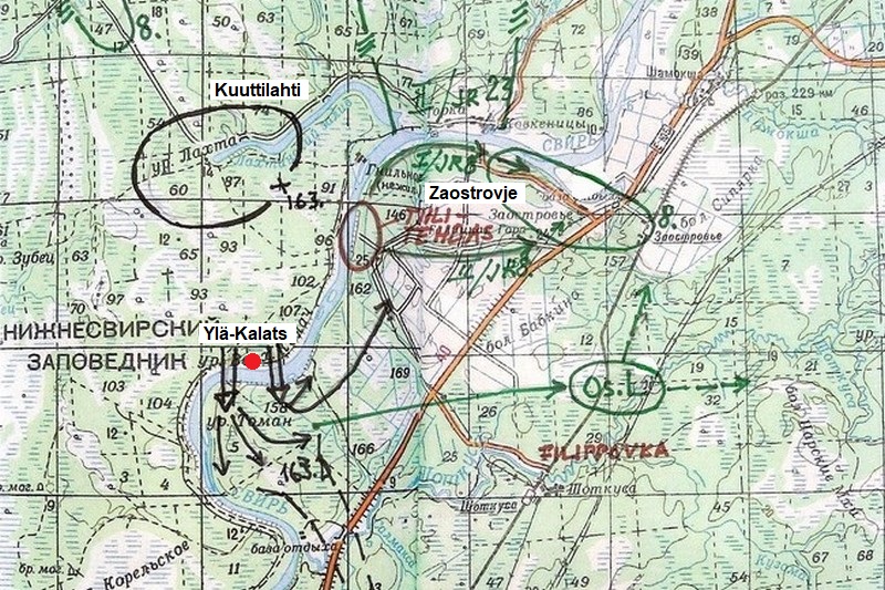 Ylimenokaistan leveydeksi oli kaavailtu yksi kilometri. Kaistalla kaksi saksalaisrykmenttiä ylittäisi joen rinnakkain, oikealla JR 307 (eversti Ritzmann) ja vasemmalla JR 301 (eversti Boisen). JR 8 11.Divisioonan kärkenä ylittäisi joen vasenta kaistaa pitkin ja etenisi itäkoilliseen joen etelärantaa vyöryttäen Zaostrovjeen. Samanaikaisesti Osasto Lampela (vahvennettu komppania, kartassa Os.L) etenisi suoraan itään, suluttaisi maantien, katkaisisi rautatien ja sen kaakkoispuolella kulkevan tien.