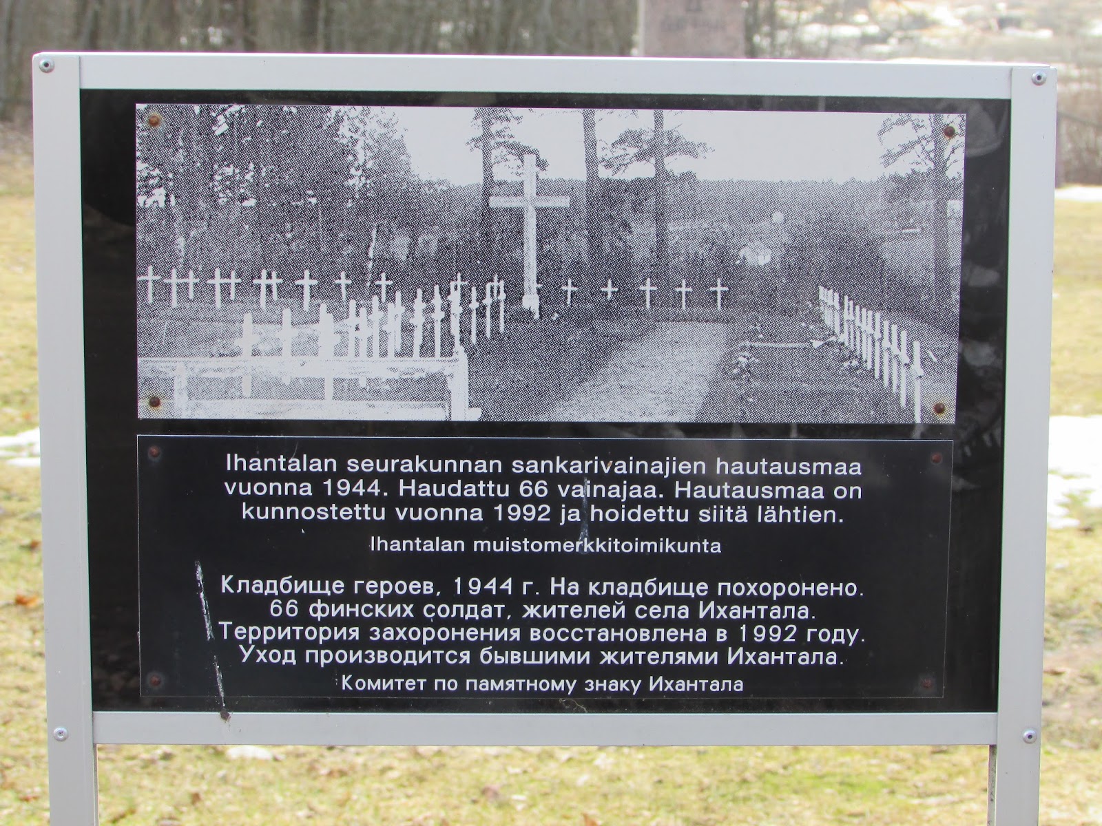 Ihantalan sankarihautausmaa sijaitsi kirkon takana, kun katsotaan tieltä päin. Hautausmaahan on haudattu 66 sankarivainajaa. Paikalla on ketjut ympäröimässä hautausmaata kivipylväineen sekä muistomerkki. JHe 2018.