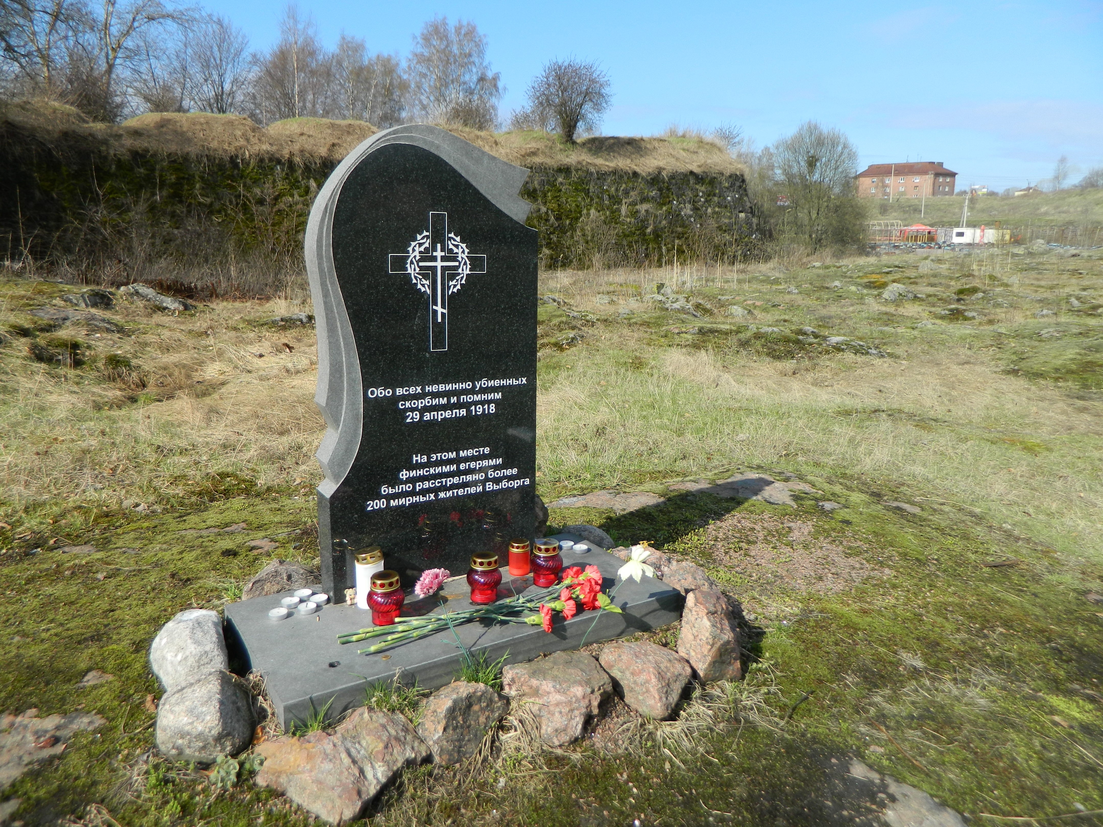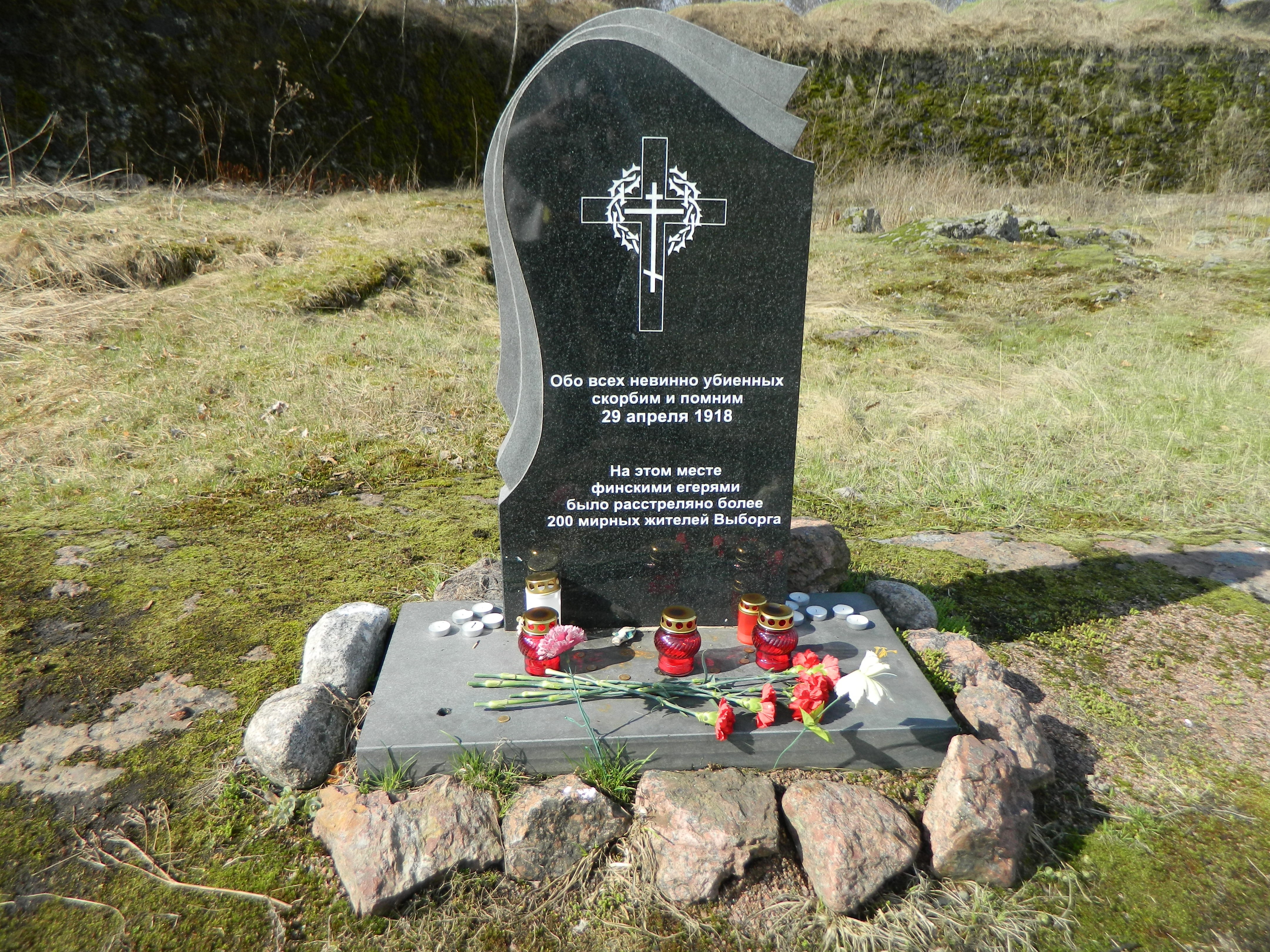 Viipurin valtauksen jälkinäytöksessä huhti -toukokuussa 1918 valkoisten toimesta suoritettiin teloituksia, jotka saivat osittain etnisen puhdistuksen leiman. Pyhän Annan Kruunun valleilla ammuttiin ainakin 360 venäläistä ja 30 eri kansallisuuksiin kuuluvaa kaupungin asukasta. Näistä 327 henkilöstä on henkilöllisyys tiedossa. Heistä vain muutamilla oli lopulta kytköksiä punakaartiin, suurin osa uhreista oli avoimesti valkoisten puolella. Pääosa teloituksista suurin osa tehtiin heti kaupungin valtauksen jälkeen 28. - 29. huhtikuuta. Seuraava teloitusryöppy toteutui 16. kesäkuuta. Tämän tapahtuman muistoksi on puistoon pystytetty tämä pieni muistokivi. Paikan historia kertoo miten vuoden 1918 hallitsematon viha purkautui, kukaan tai mikään ei kyennyt estämään tapahtumaa. MKe 2018.