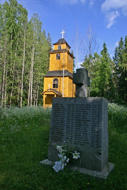 19.6.1921 pystytetty paljastetun sankarihaudan nuorukaista esittävä patsas on kadonnut, jalusta säilynyt. Talvi- ja jatkosodan vainajille ei ehditty perustaa erillistä muistomerkkiä. Heidän nimensä on kaiverrettu sankaripatsaan jalustaan. Kuvat: Internet Tiedot: Karjalan liitto MKe 2018.