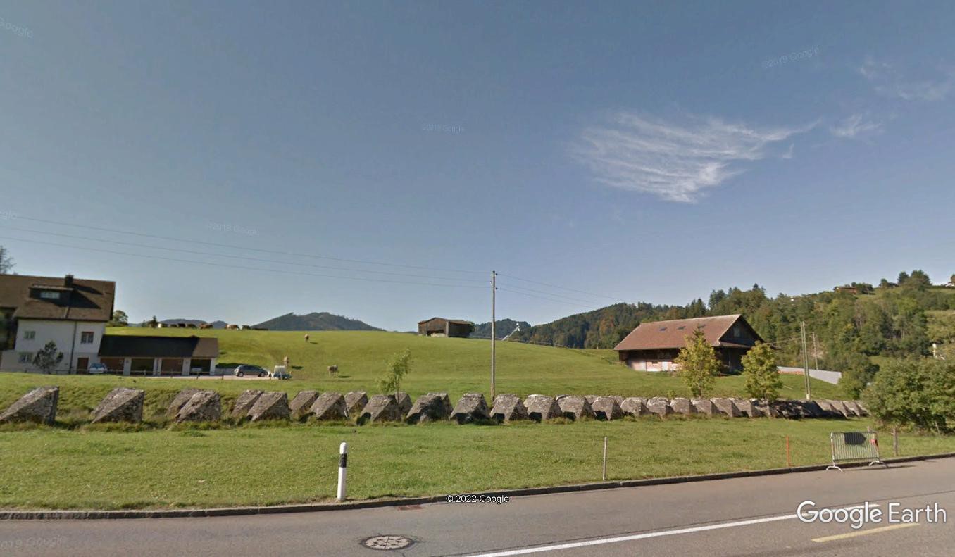 Tämä panssarieste on jo syvemmällä sisämaassa. Maasto täällä vaatii betonisen estelinjan. Kuvan keskellä mäellä lautaverhoiltu rakennus, bunkkeri jossa melkoisella varmuudella on PST-tykki. Tukikohta on rakennettu vuonna 1943.