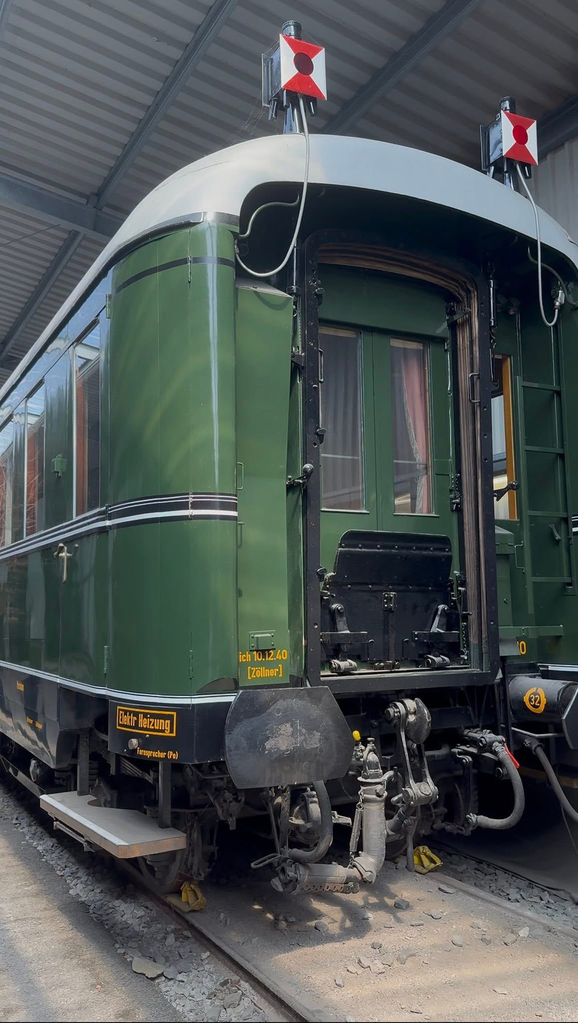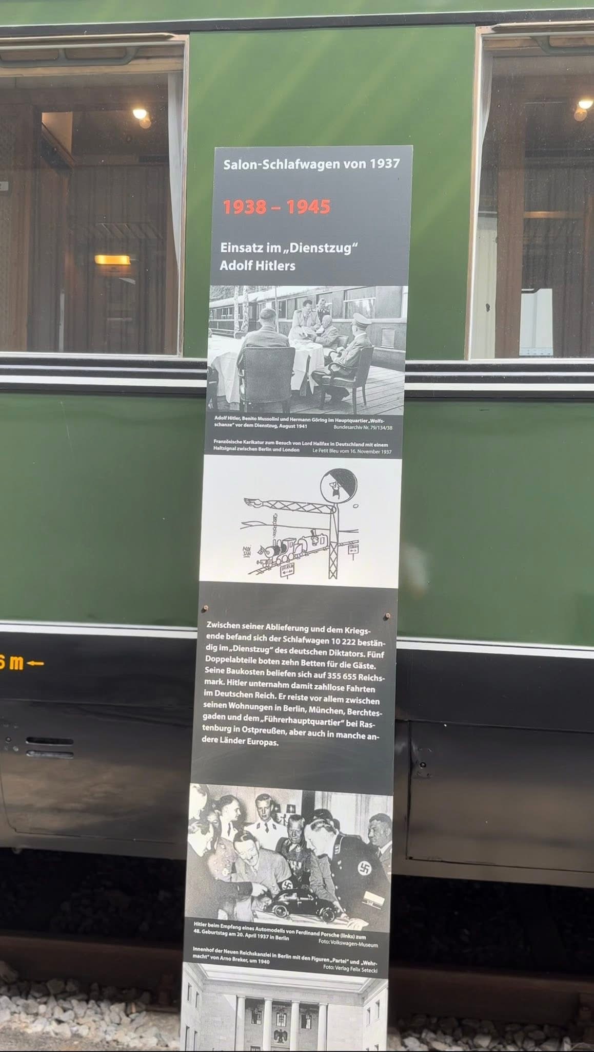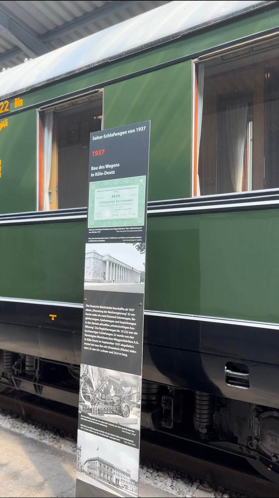 Adolf Hitlerin salonkivaunu Bln 10 222 esiteltiin yleisölle Bochum-Dahlhausenin rautatiemuseossa 16. toukokuuta 2014. Sisä- ja ulkopuolen entisöinti kesti hyvät 18 kuukautta ennen kuin se palautettiin entiseen loistoonsa. Vaunun toisella puolella ja päädyssä on kuvattuna se vuodelta 1939 (Deutsche Reichsbahn), kun taas toisella puolella se on vuoden 1974 Deutsche Bundesbahnin värityksessä. Kuva otettu 22. toukokuuta 2014.