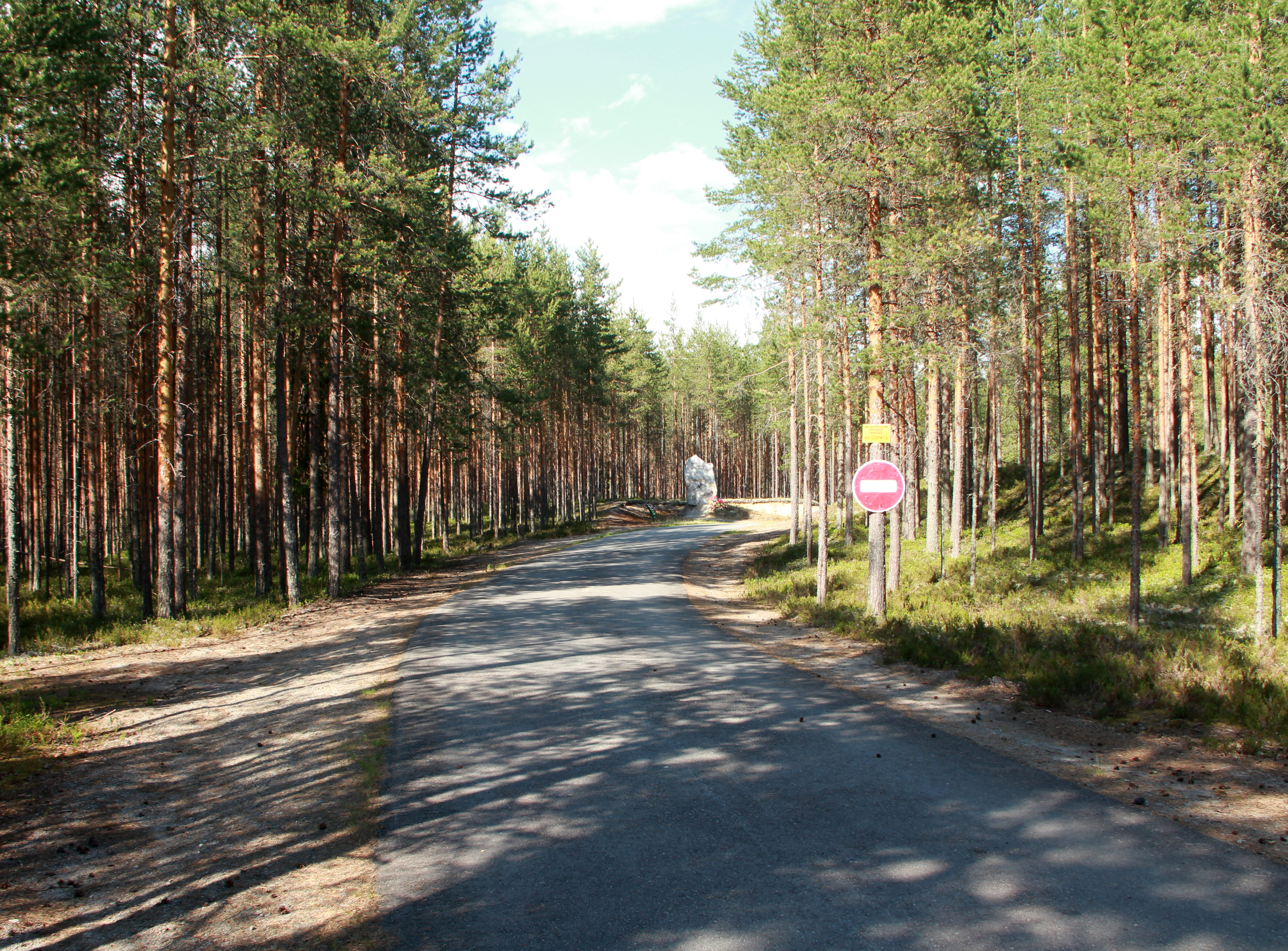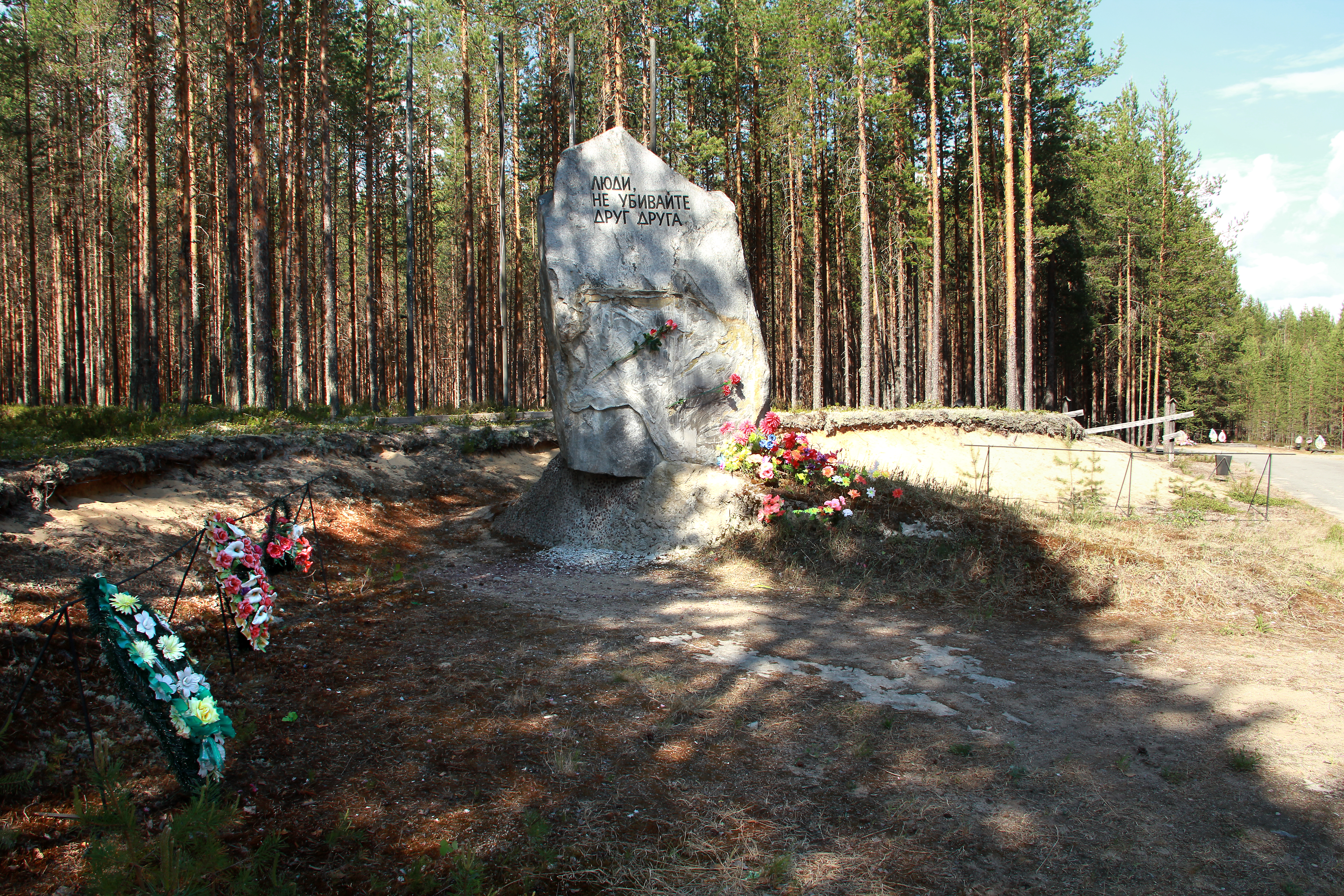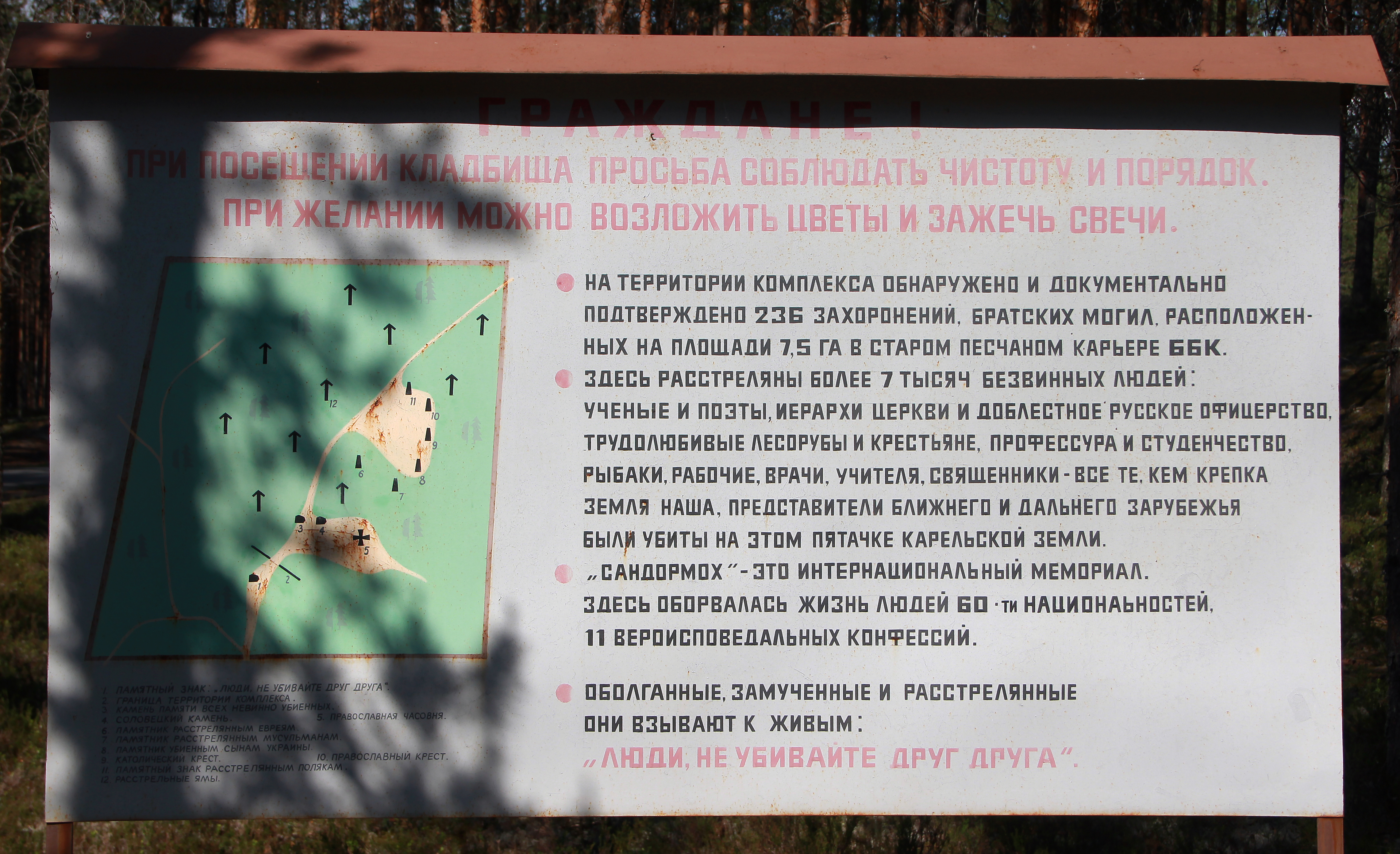 Sandarmohin hautausmaa, Stalinin puhdistukset. Paikka on kuivalla mäntykankaalla, jossa on toistatuhatta neliönmuotoista n.2x2 m kokoista painannetta. Stalinin 1937 puhdistuksissa teloittamat ihmiset ovat kaivaneet kuoppansa, johon heidät on teloitettu. 4-5 vainajaa samaan kuoppaan. Runsas 10 000 uhria on siellä saanut viimeisen leposijansa, heistä suomalaisia 1150. Paikalle on pystytetty kappeli, jonka sisällä on luettelo teloitetuista. Sinne tänne männikköön on pystytetty puisia ristejä, luterilaisia ja ortodoksisia, nimin varustettuina, paikka ei välttämättä ole oikea. Alueen toisessa päässä on puolalaisten ja slovakkien iso risti.
