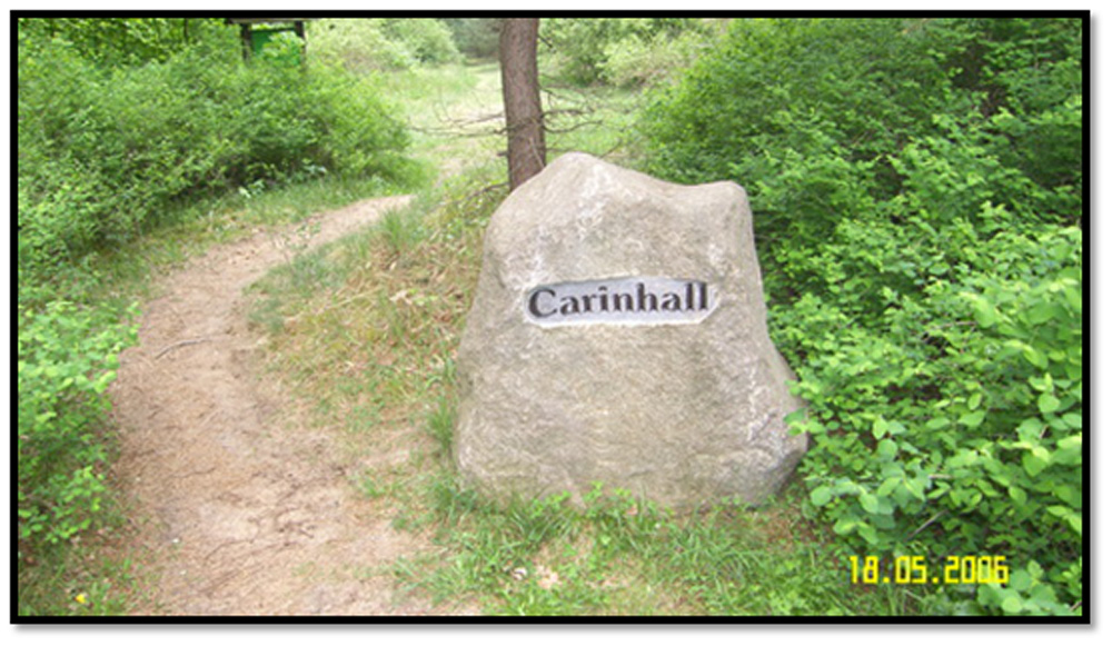 Carinhall oli Göringin metsästysmajoista tunnetuin, se sai nimensä hänen ensimmäisen vaimonsa mukaan. Göring valvoi henkilökohtaisesti paikan hävittämistä vuoden 1945 huhtikuussa. Porttikuva on Carinhallin portilta, itse rakennuksen paikalle on matkaa noin kilometri.Paikkakunta on Schorfheide, Saksa. MKe 2014.