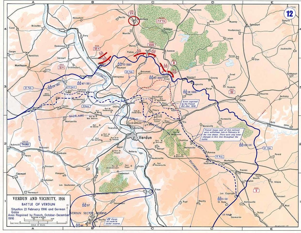 Philippe Petain oli se mies joka uskoi puolustukseen. Hän lähti puolustamaan linnoitusta. Ensin rintamassa oli vain 30000 ranskalaista, saksalaiset alottivat hyökkäyksen 150000 miehen voimalla, lopulta täällä taisteli yli miljoona miestä. Vihjeet saksalaisten hyökkäysestä oli jo olemassa, näihin tietoihin Joffren esikunta ei puuttunut mitenkään. Kuvaavaa on ettei tällä kaistalla ollut toista juoksuhautalinjaa.