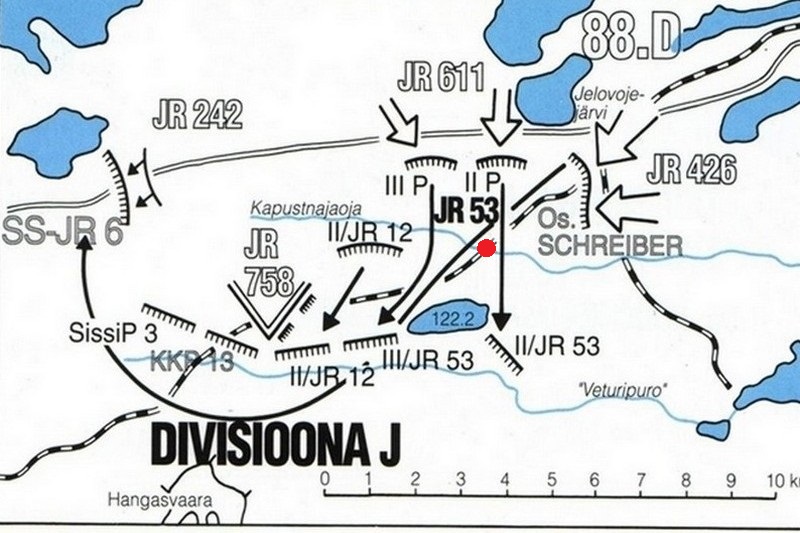 Kiestinki - Louhi rautatien silta Kapustnajajoella. Tässä aivan lähellä oli everstiluutnantti Jussi Turtolan komentopaikka. Paikka jää sillan eteläpuolelle, toisaalla tässä järjestelmässä. MKe 2015.