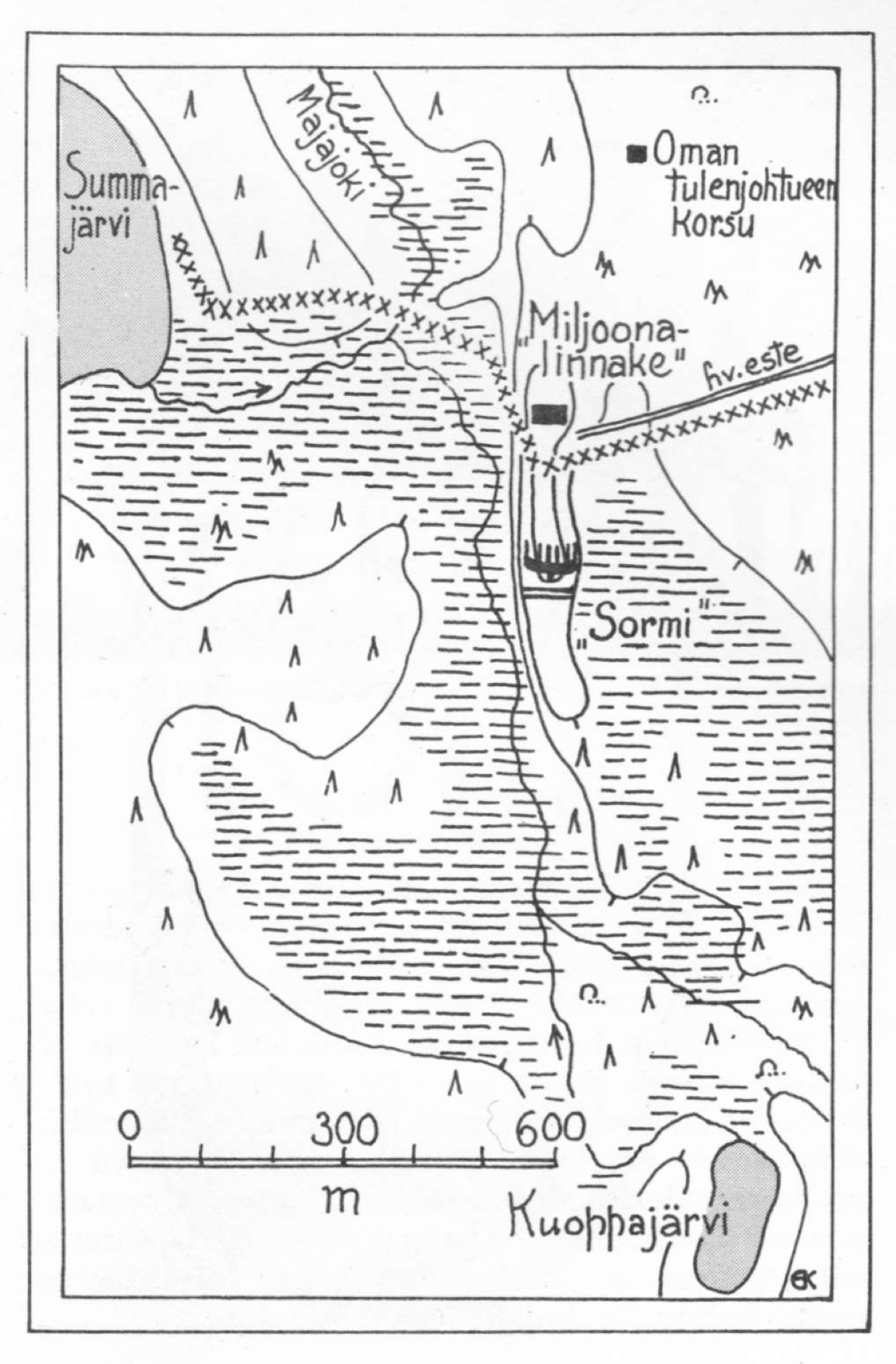 Miljoonan ja Sj 4 eli Popiuksen, välissä on notkelma, jossa oli yhdyshauta panssari- ja piikkilanka esteineen. Lännessä oleva isompi linnake on Sk 10, näiden väliin oli rakennettu Summajärven rantaan tukikohta, josta käytettiin nimeä Kari.