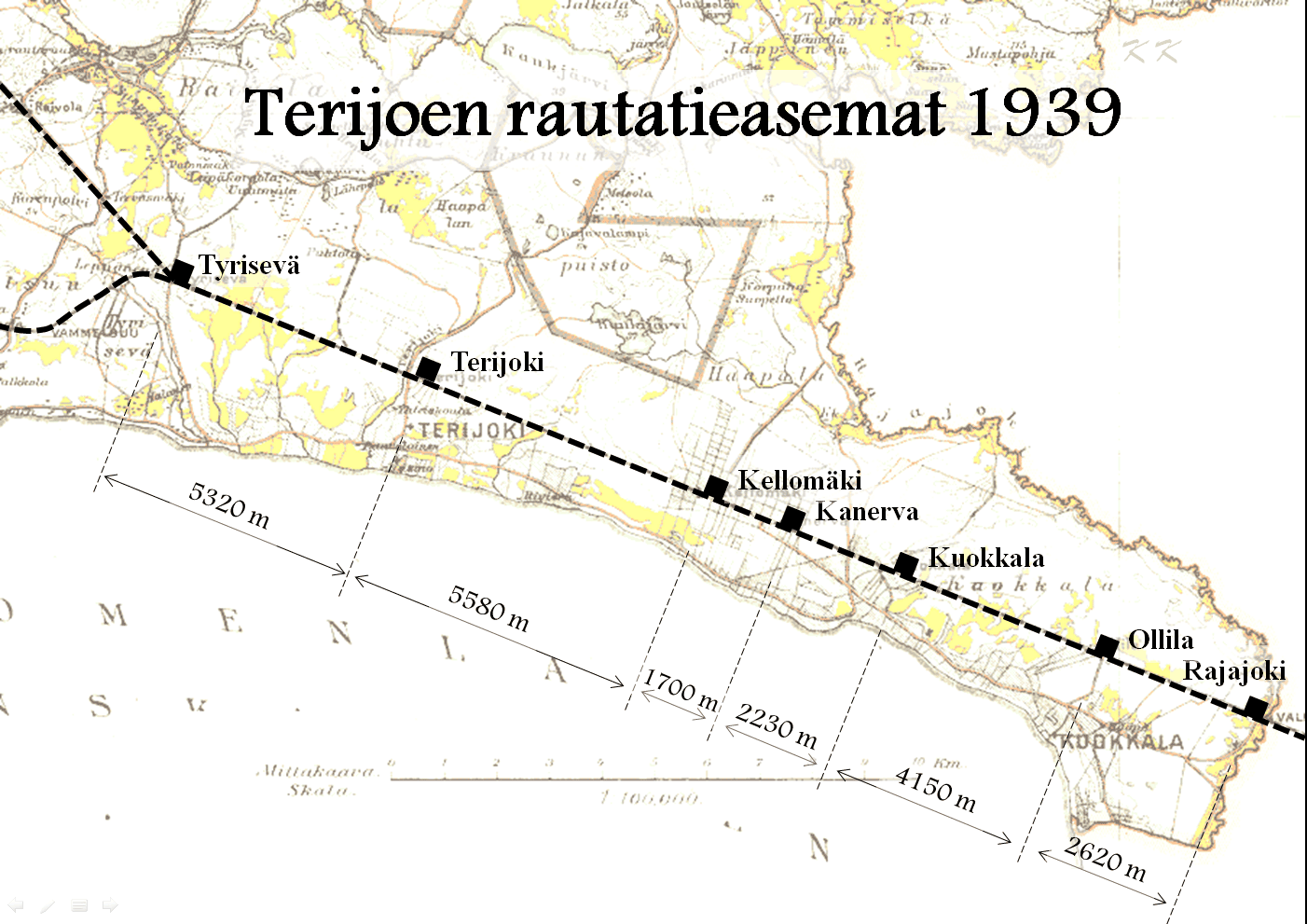 Terijoella oli kaikkiaan 7 asemaa, Tyrisevä, Terijoki, Kellomäki, Kanerva, Kuokkala, Ollila ja Rajajoki. Terijoen asema meni huonoon kuntoon pommituksissa ja osa rakennuksesta on enään jäljellä.Kaariholvi on sodan jälkeen rakennettu, kun taas radan alta kulkeva tunneli on säilytetty.