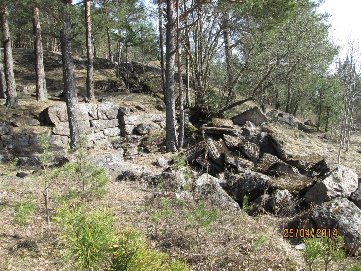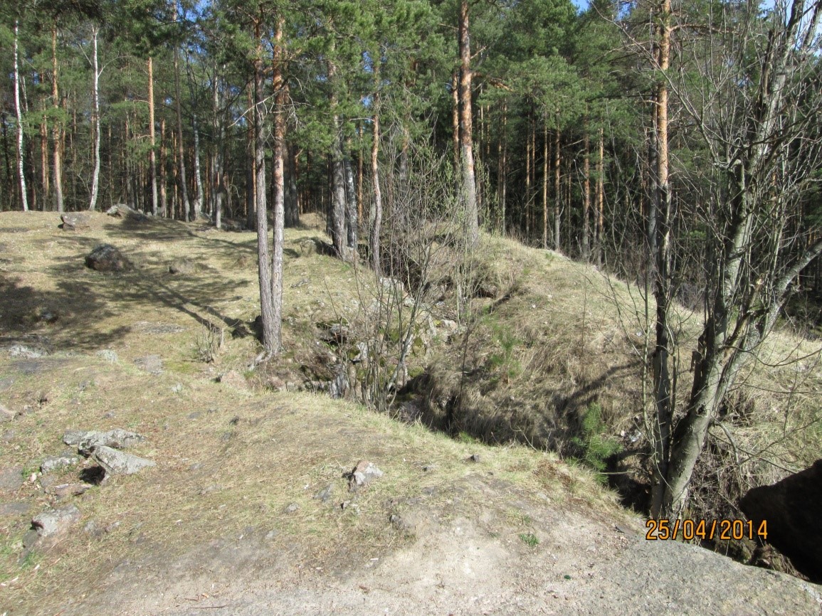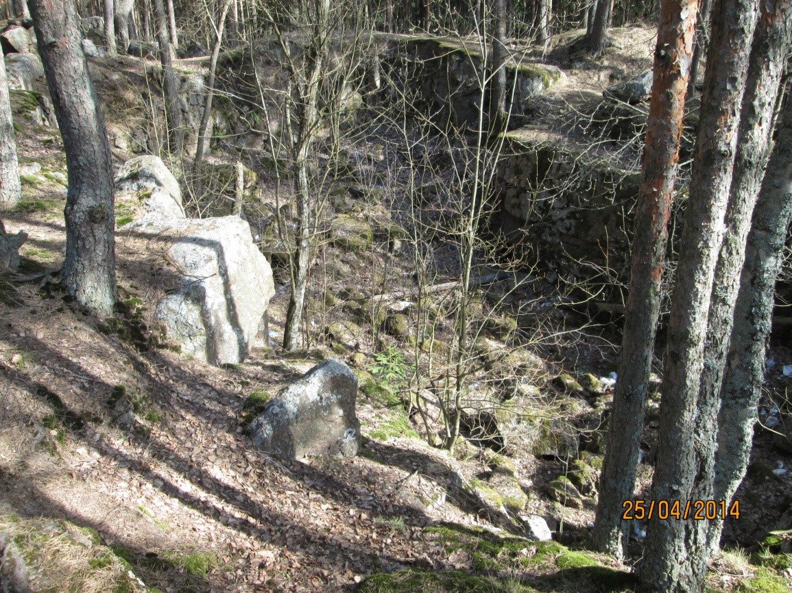 Kuvassa kallioon louhittu miehistösuoja, toinen vastaava on 30 metrin päässä vähän ylempänä. Kallioon louhittua juoksuhautaa löytyy tältä paikalta molempiin suuntiin noin kilometrin verran. Paikka on toisen pataljoonan seitsemännen komppanian vastuualuetta.