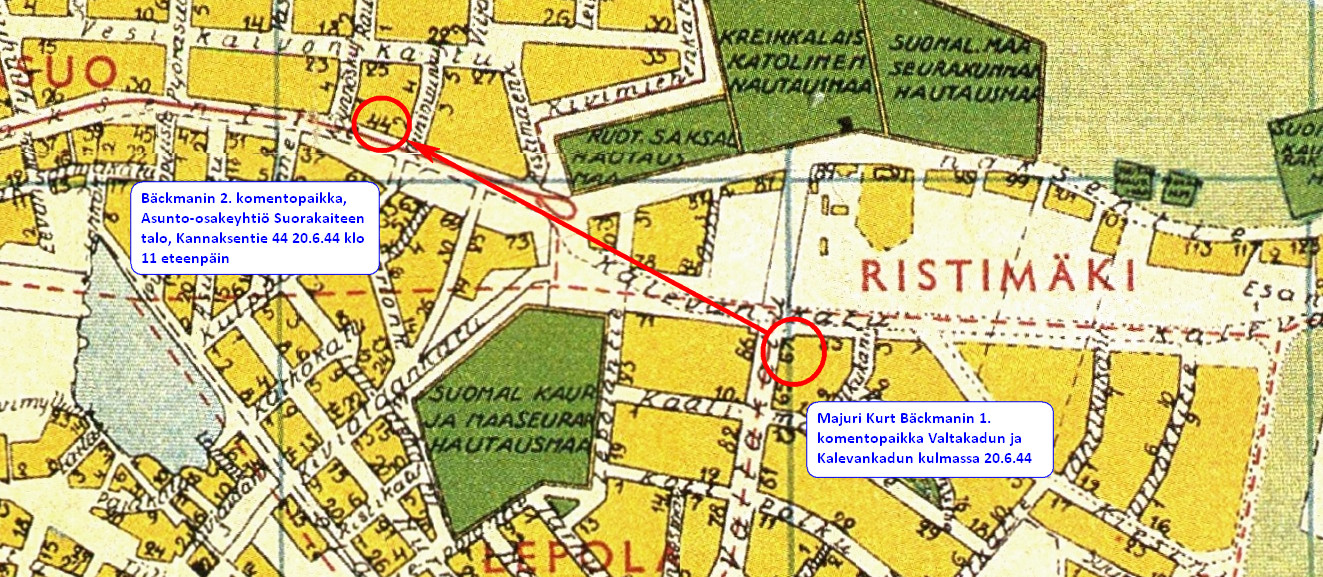 20.6.1944 majuri Bäckmanin komentaman II P/20.Prikaatin komentopaikka oli ensimmäiseksi tässä rakennuksessa. Majuri Bäckman siirrätytti komentopaikan kriittisellä hetkellä ( n. klo 11 ) 500 m taaemmas osoitteeseen Kannaksentie 44, väärinkäsitysten ja epätietoisuuden säestyksellä Viipurin puolustus mureni nopeasti tältä kohdalta.