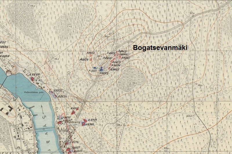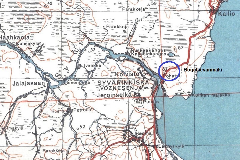 Bogatsevanmäki on huomattavan korkea mäki Voznesenjan koillispuolella Syvärin pohjoisrannalla. Mäkeen kantalinnoitettiin yhden komppanian puolustuskeskus, missä Suomen mies seisoi vartiossa vielä 23.6.1944. Kuitenkin linnoitus oli jätettävä taakse Aunuksen kannaksen länsiosan yleistilanteen takia ja jatkettava viivytystaistelua käyden pohjoiseen. ENa 2017.