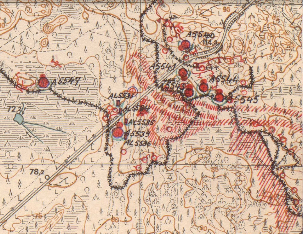 Linnoitteet sijaitsevat Lopinanpelto - Vytegra tien molemmin puolin ennen Podporozea kahdessa tasossa. Kaikista kk-linnoitteista on rautakuvut viety. Moni matkalainen on ihmetellyt tien parannuksen yhteydessä maan pinnalle, tien laitaan siirrettyä pallokorsua, AL 5585. Tämä pallokorsu on etummaisen tasan majoituskorsu. samalla puolen tietä ollut kk-pesäke A5539 on todennäköisesti jäänyt maanläjitusalueen alle, AL5586 pallokorsusta näkyy pallokorsun katto sähkölinjan alla. Taempi tasa on etutasasta n 500 m koilliseen olevan tienhaaran molemmin puolin. Kohde on helposti saavutettavissa esim linja-autoryhmille.