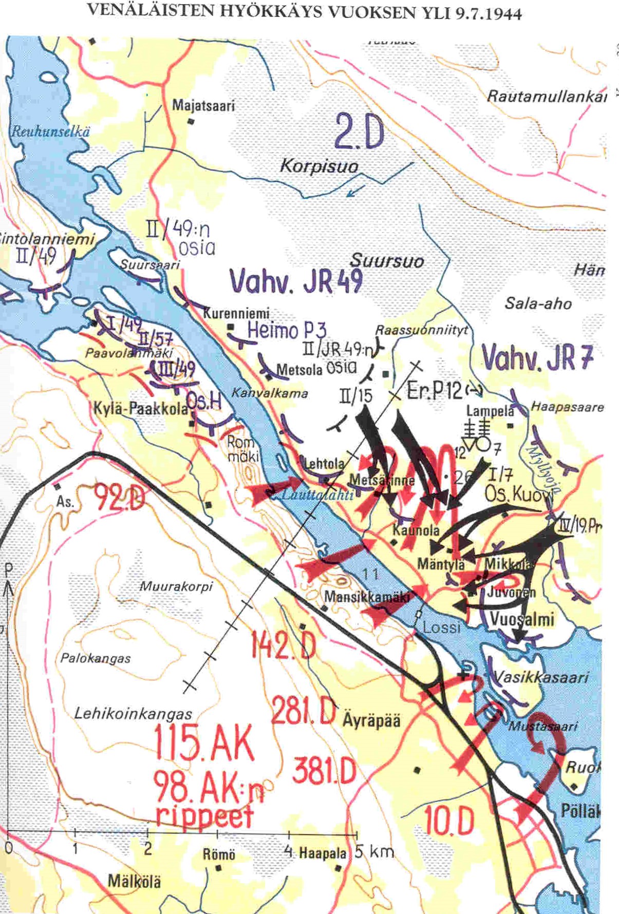 Äyräpään sillanpäävaiheen kiivaiden taisteluiden päätyttyä alkoi venäläisten Vuoksen ylimeno Vuosalmen puolelle 9.7. klo 06.00 jälkeen kymmenillä moottorilautoilla ja -veneillä tykistötulen ja savutusten suojaamana. Sisäänmurto tapahtui lossin rannasta Oravakytöön johtavan tien suunnalla. Venäläisten hyökkäyskärki taisteli tiensä aivan taisteluosasto Ehrnroothin komentopaikan tuntumaan. Eversti Ehrnrooth kielsi tässä kriitillisessä tilanteessa ketään vetäytymästä ja käski myös tykistön ja krh:n komentopaikkojen puolustautua saarrettunakin. Hän järjesti komentopaikan lähipuolustuksen, haali kokoon rykmentin jääkäreitä ja pioneereja, jotka suuntasi vastaiskuun. Jääkärijoukkue löi raisulla vastaiskulla viholliskärkeä taaksepäin noin 800 metriä. Klo 11.00 taisteluosasto Ahola (Er.P 12 vahvennettuna II/JR 15) aloitti vastahyökkäyksen luoteesta ja valtasi nopeasti pisteen 26 maaston jatkaen Mäntylän kautta Metsärinteen-Mäkipellon-Kaunolan tasalle lyöden vihollisen tällä kaistalla Vuosalmen aukeille.