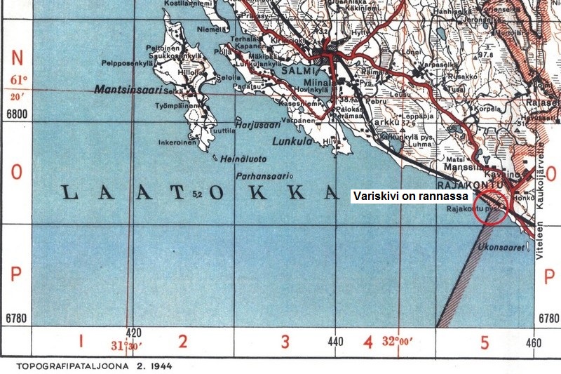 Miten mennä kohteeseen: Variskivelle pääsee kätevimmin ajamalla Rajakonnun (Pogrankondushin) mäeltä etelään päätietä pitkin ja vielä Aunuksen radan ylitse. Kylämäeltä on 2,3 kilometriä radanylityskohtaan. Sata metriä radan jälkeen lähtee oikealle "kesämökkitie" Laatokan rantaan. Tavallinen henkilöauto kannattaa jättää tähän sopivan paikkaan parkkiin ja lähteä kävelemään uraa ja rantaa pitkin pohjoiseen. Matkaa kivelle on noin 2,6 km eli puolisen tuntia. Jos käytössä on maasturi, on mahdollista ajaa Variskivelle asti Laatokan kovapintaista hiekkarantaa pitkin. ENa 2017.