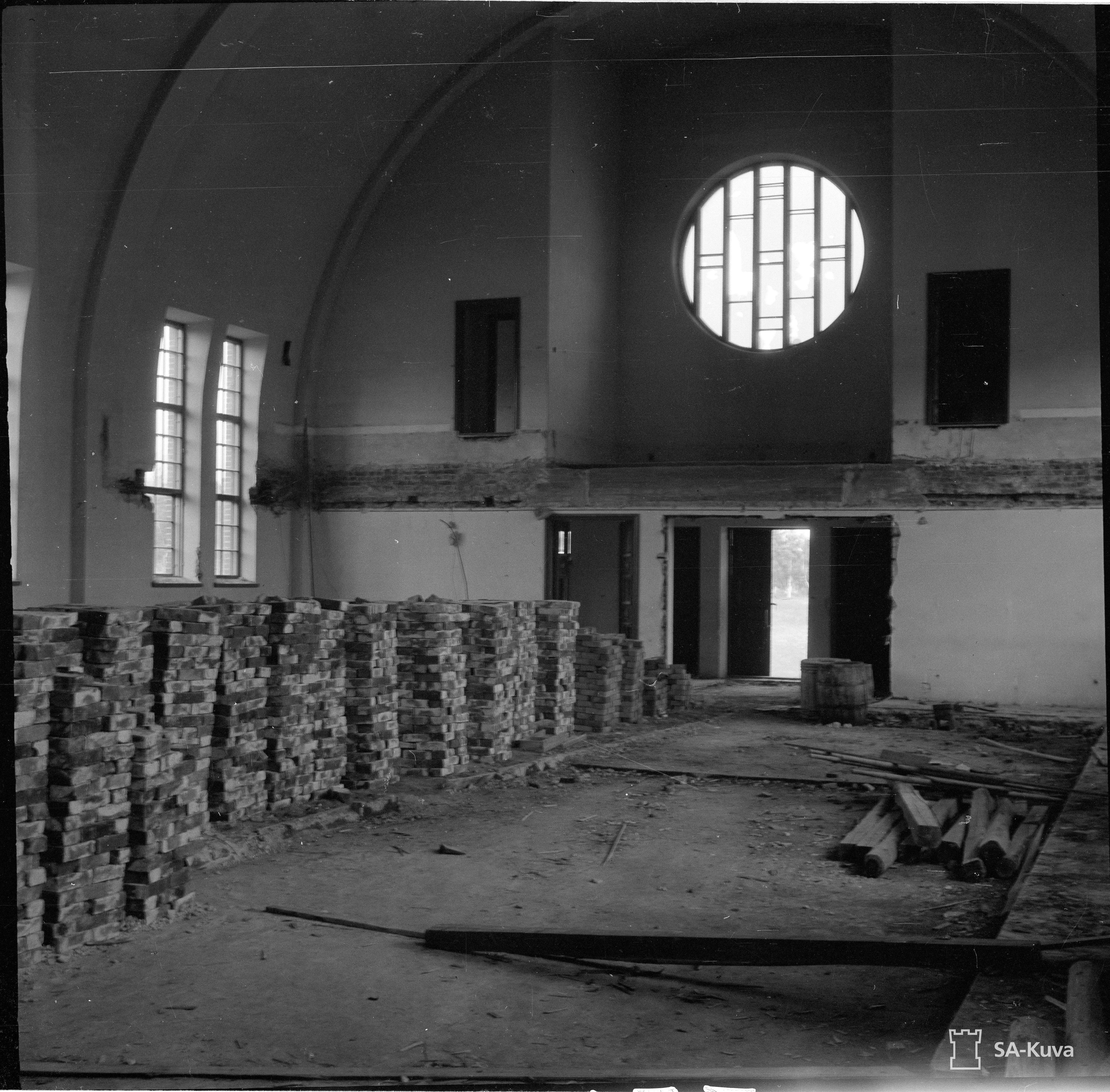 Kirkko on tyhjillään, hautausmaalta löytyy Vapaussodan hautoja ja muistomerkki. Hautausmaa on tien toisella puolella. Vanhat kuvat elokuulta 1941. Me 2014.