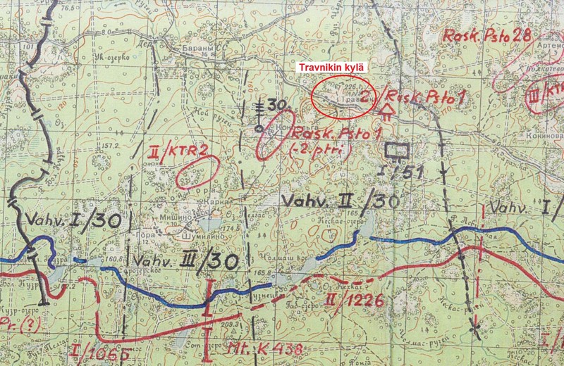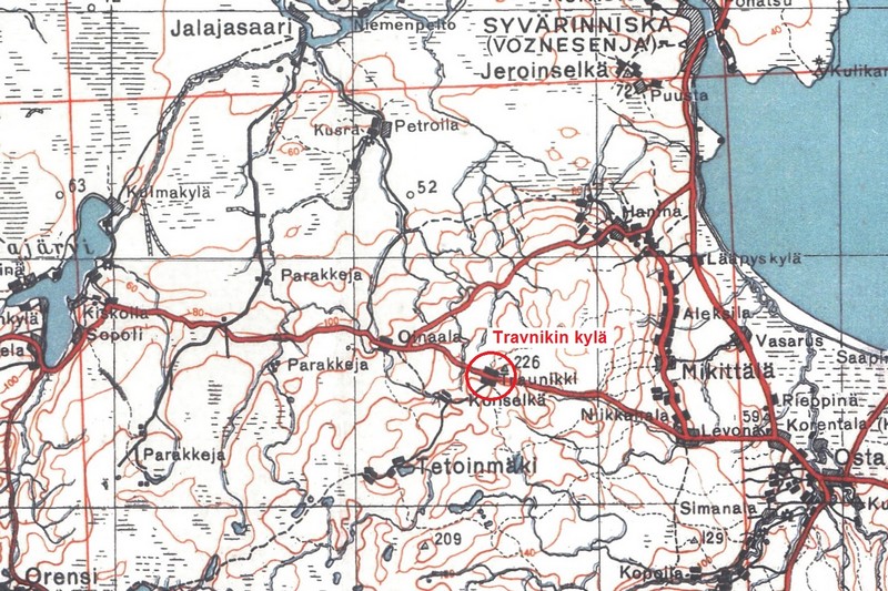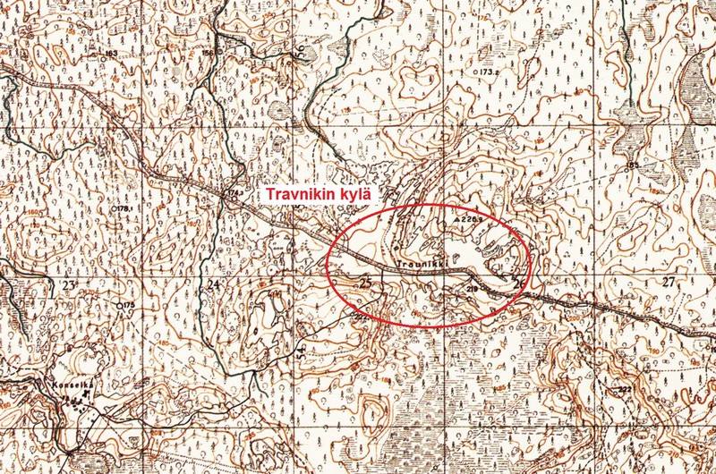 Entinen Travnikin kylä sijaitsee länsi-itä-suuntaisen Podporoze-Osta -maantien varrella. Siitä lähti kylätie Konselän, Karkan ja Goran kautta Kuzrajärville etulinjaan. Seutu on ylänköä, jossa korkeustaso 220 metriä ylittyy monin paikoin. Asemasodan aikana Travnikin perusmiehityksenä oli yksi reservikomppania. ENa 2016.