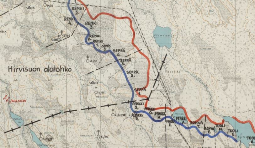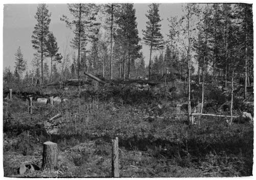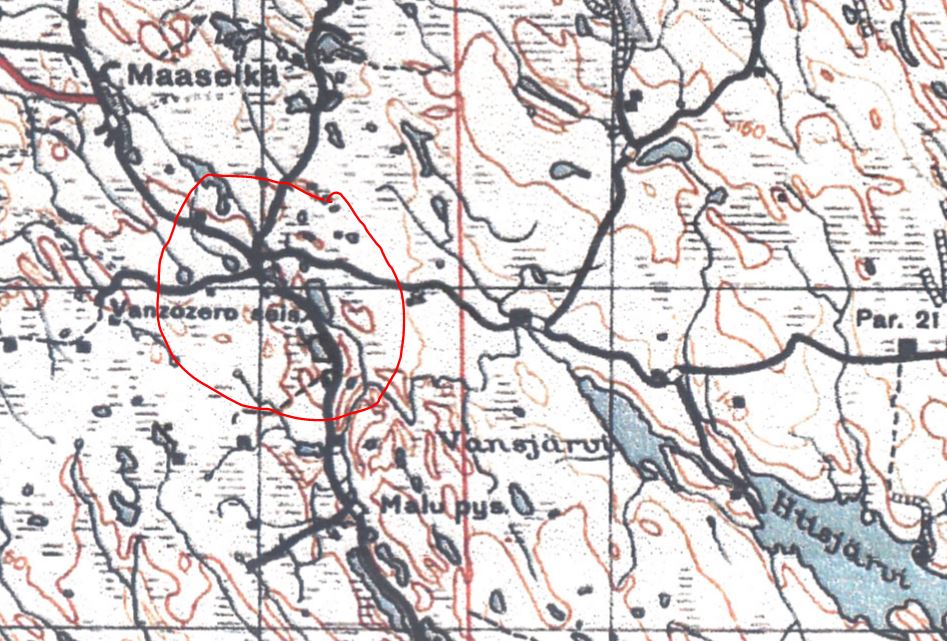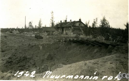 Krivi2.jpg: Krivin asema ja Muurmannin rataa. Kuvassa aseman edessä näkyvän kopin eteen pinottiin kaatuneet, mistä ne vietiin kuorma-autoilla Karhumäkeen. Monttu kuvassa on pommikuoppa. Kuva: Nautelankosken museo.