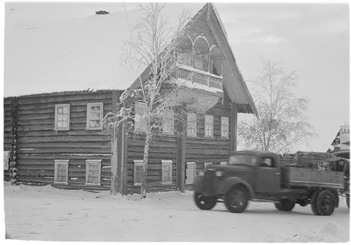 selki3.jpg: Miinaan ajanutta autoa tuodaan korjaamoon. Selki 1942.02.03 SAKuva