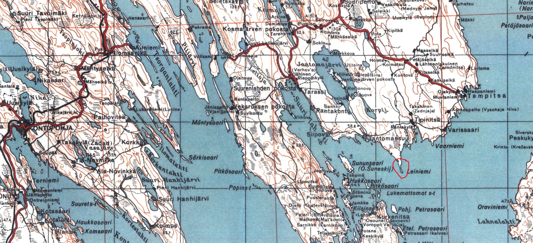 Leiniemessä sijaitsi Jatkosodassa Äänisen Rannikkoprikaatin Rannikkotykistörykmentti 14 407. Kev.Ptrin tuliasemat, kalustona oli 2 kpl 75/50 C tykkiä. THa 2016