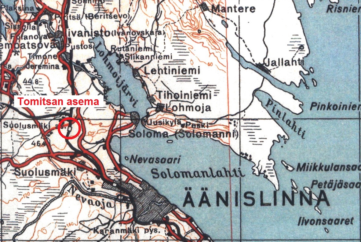 Myöhemmin Jatkosodan aikana kaikki Äänislinnan asemaa käyttäneet junat kulkivat Tomitsan aseman kautta, jonka jälkeen rata haarautuu Suojärven suuntaan (Helsinkiin) ja jatkuu Karhumäen suuntaan (Maluun). ENa 2017.